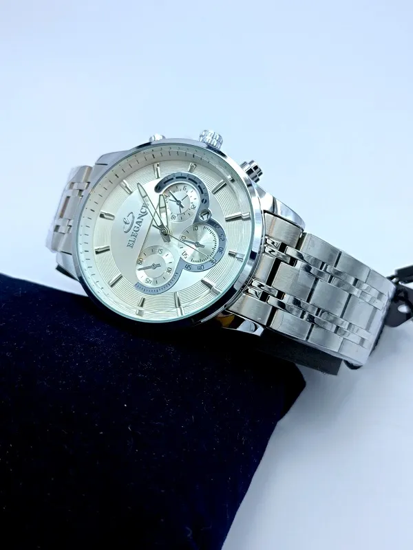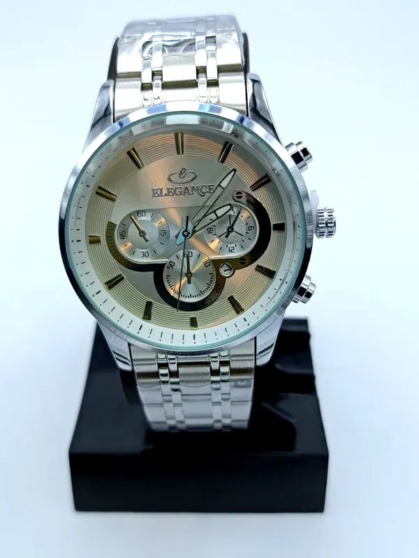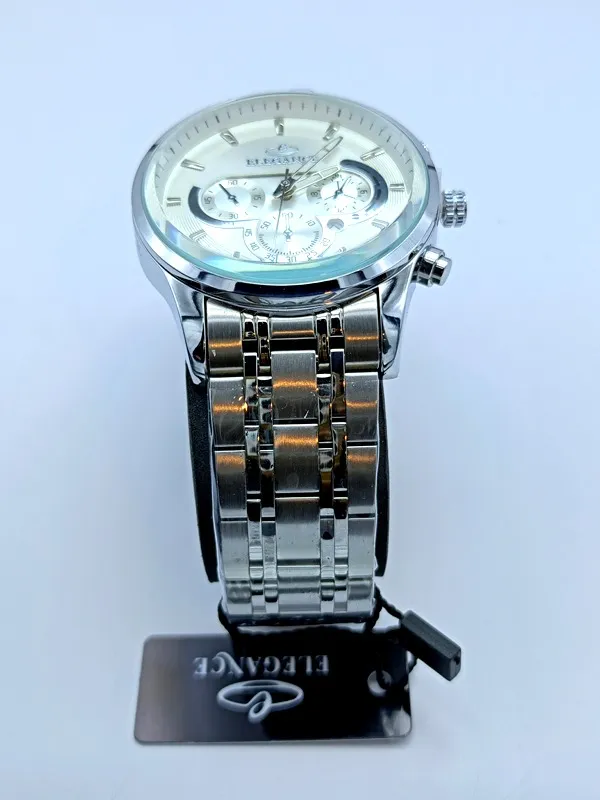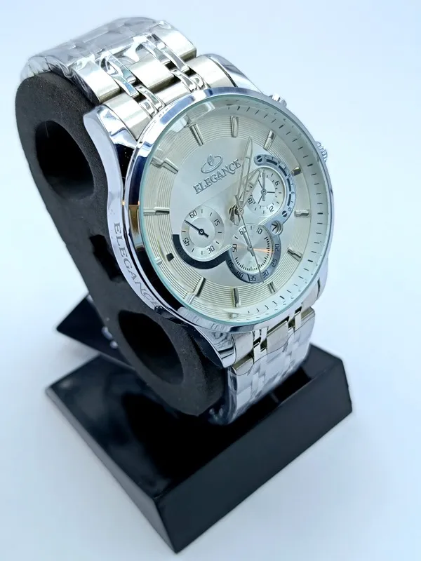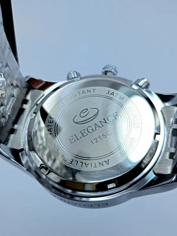 بند و بدنه از متریال باکیفیت مثلاً استیل ضدزنگ، بند چرمی خوب، شیشه مقاوم. در برند خاصی که در ایران با نام Elegance عرضه میشود، همین حالت دیده شده است.